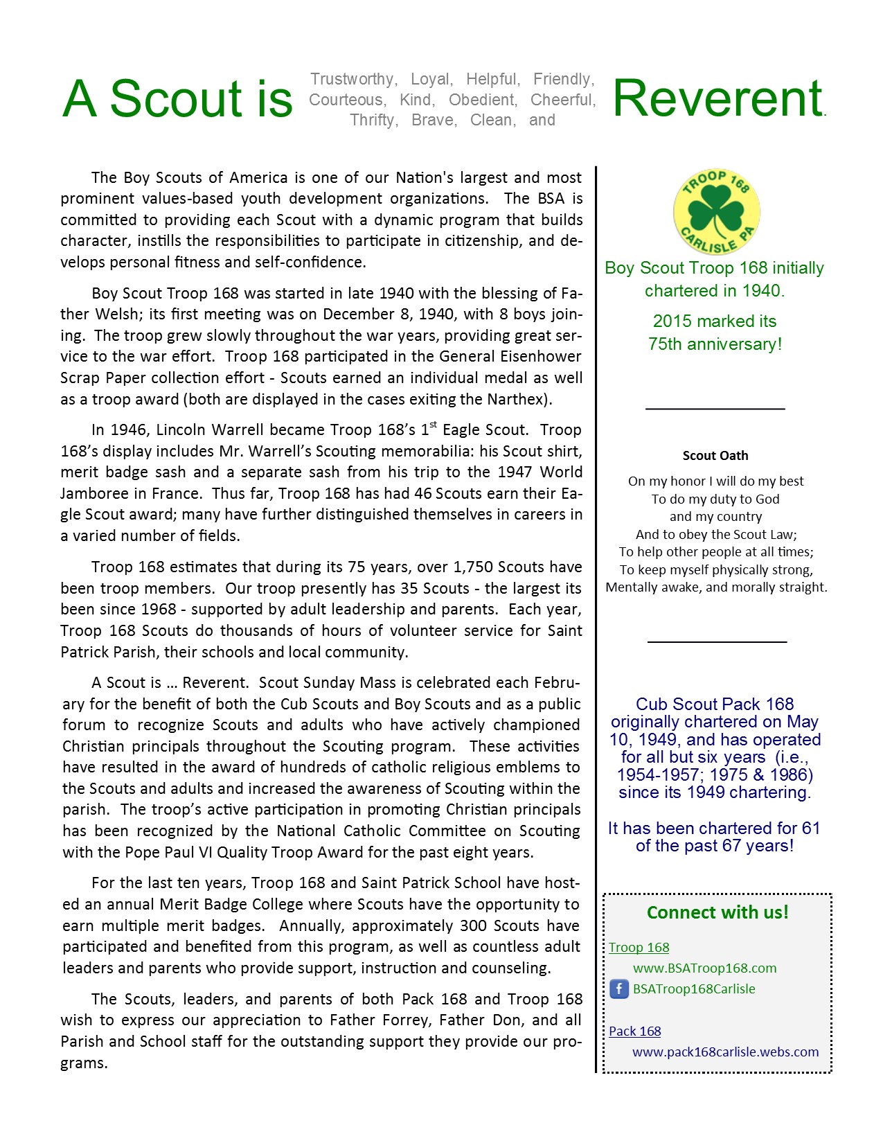 To mark Troop 168's 75th anniversary, its history was recapped for a bulletin insert on Scout Sunday 2015.